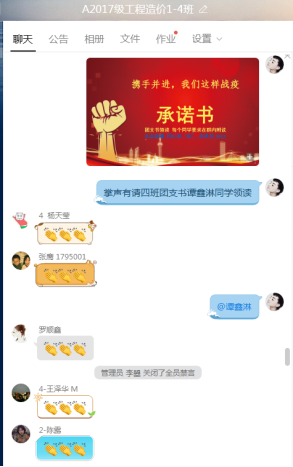 班会开始,易老师先是用语音和大家寒暄问候,了解同学们在寒假生活中都发生了什么有意思的事。同学们也群里纷纷响应易老师,或发表情或语音签到。在同学们都签到后,易老师在群里发了两个视频,一个是向战疫者致敬,强调了爱国主义教育;另一个是防疫小妙招,告诉同学们如何在疫情期间更好的保护好自己和身边的家人。易老师还指出,在疫情面前,在困难面前,党员、班团干部要起到先锋模范作用;同学们要遵守国家的法律法规,遵守学校的规章制度;听从国家与学校的安排;并且她在群里倡导同学们进行公开承诺,首先由四班团支书谭鑫淋同学领读,然后同学们纷纷附议;随后,易老师还给同学们分享了疫情期间的“十字箴言”,她提醒同学们保持通讯畅通,随时关注群消息。最后, 她强调要关注群里的网上教学安排,多跟任课老师交流,在家中实现停课不停学,并且她还要求同学们认真书写新学期的学习计划。此外,她还为同学们推送了健身小视频,希望同学们加强锻炼,保持身体健康,远离新型冠状病毒。
