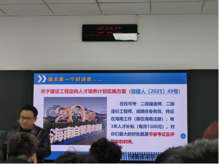 工程造价专业邀请重庆数维空间陈柯良总经理、艮石精界王冀元总经理围绕“从认知到规划”主题开展了专业讲座,面对 AI 挑战,强调同学们要具备“价值判断、沟通协调、职业底线”等核心能力。结合国家“十五五”规划,聚焦城市更新、数字基建、绿色低碳三大信号,用 BIM 技术算准账、用大数据预判市场、用绿色理念评估价值,贯穿设计、施工、运维全生命周期。鼓励同学们学好专业知识,利用寒暑假深入企业,关注行业新闻动态,成长为“懂技术、精算量、善管理”的高素质人才。