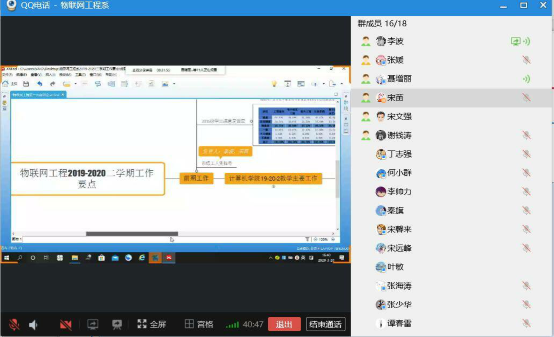 本网讯(文/图 秦旗) 根据新冠病毒疫情防控期间“停课不停学、停课不停教”的要求,按照计算机与物联网学院整体教学工作安排,物联网工程系严格按照教学计划开展实施了线上教学,为了进一步做好线上教学各项工作,明确本学期的重点工作任务, 2020年3月20日下午16:00,物联网系组织召开了线上教学工作总结与研讨网络电话会议,会议由物联网系副主任宋苗主持,系全体教师参加。