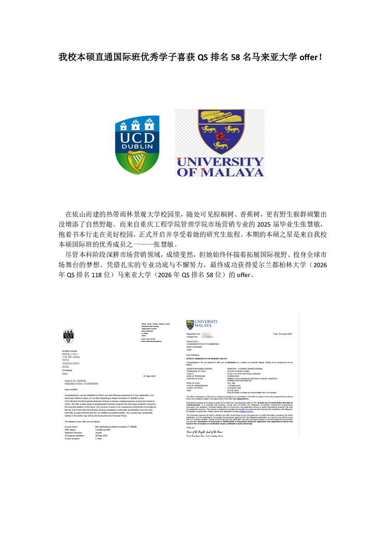 我校本硕直通国际班优秀学子喜获QS排名58名马来亚大学offer!