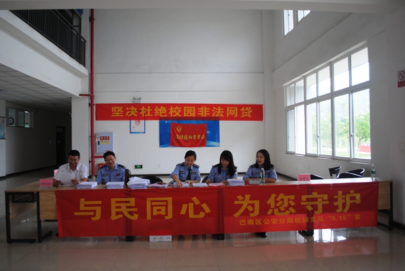 本网讯(保卫处 罗心智)为进一步加强我校师生对校园网贷的认识,引导师生理性消费,远离非法网贷,5月15日上午10:00,学校保卫处联合重庆市公安局巴南区分局校保支队、经侦支队、南泉派出所、重庆工程学院大学生安全管理委员会等组织开展主题为“坚决杜绝校园非法网贷”的宣传教育活动。