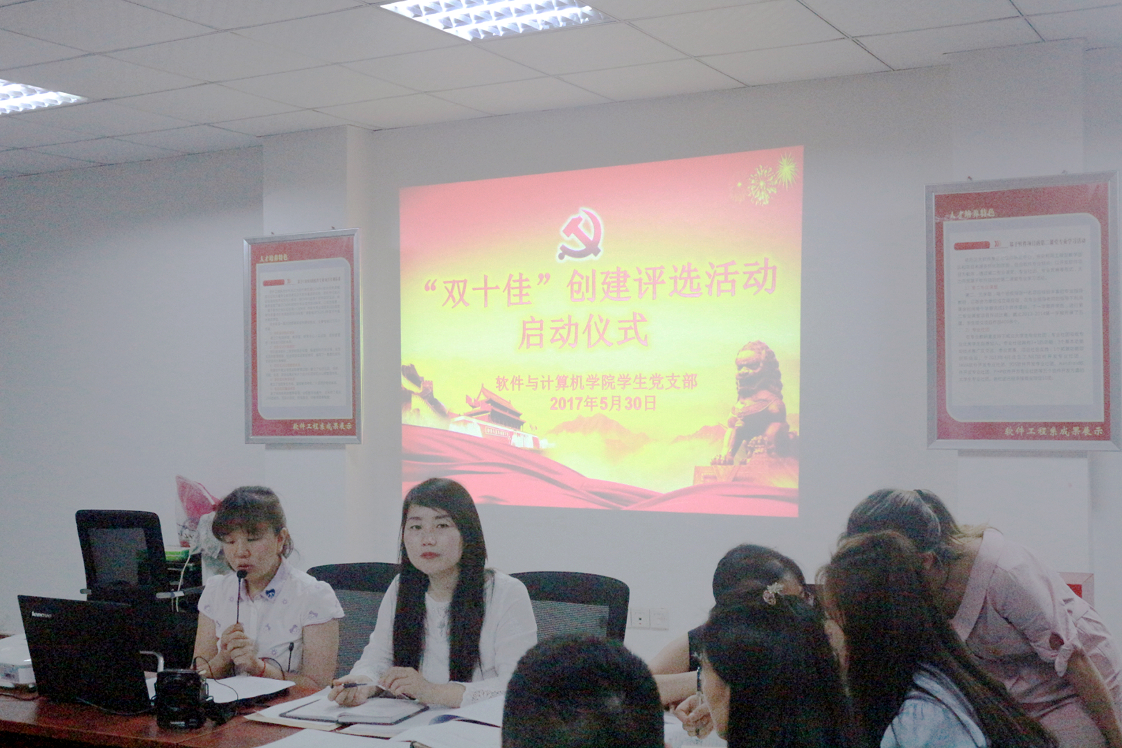 本网讯(软件学院 王薇)为了健全“两学一做”学习教育常态化机制,争做“四讲四有”合格党员,根据《大学生党员“十佳示范岗”“十佳示范星”评选表彰奖励办法》(渝工程委〔2017〕27号)文件精神,2017年5月30日晚上8:00,软件与计算机学院在3501教室举行了大学生党员“双十佳”创建评选活动启动仪式。学院党总支书记胡海燕以及学生党支部全体党员、预备党员参加了启动仪式。仪式由学生党支部书记王薇主持。