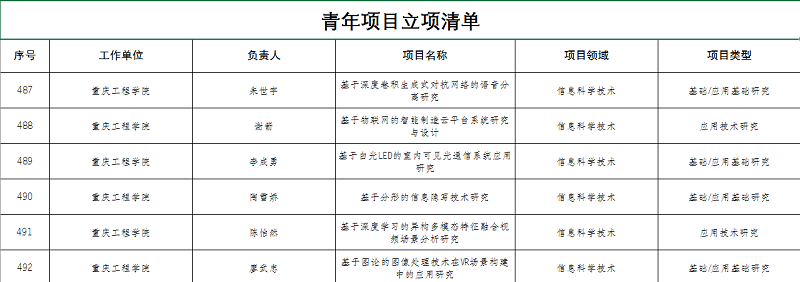 获批立项的青年项目,为朱世宇、谢箭、李成勇、陶雪娇、陈怡然、廖武忠、张优敏、张媛、李英吉等老师,分别主持的《基于深度卷积生成式对抗网络的语音分离研究》、《基于物联网的智能制造云平台系统研究与设计》等9个项目。