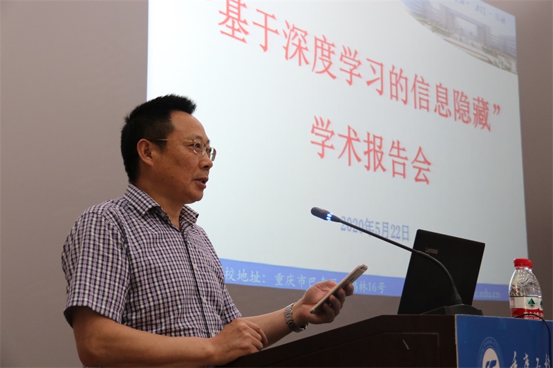本网讯(文/图 大数据学院 靳冲)5月22日下午,由我校教师发展中心主办、大数据与人工智能学院协助承办,在南泉校区办公楼阶梯会议室举办了一场题为“给予深度学习的信息隐藏”的专题报告会。此次报告会特别邀请到教育部数字取证工程研究中心主任孙星明教授担任主讲,校党委书记谭明术担任报告会主持,来自大数据与人工智能学院、计算机与物联网学院、软件学院、电子信息学院负责人和部分专业教师等共计65人现场参加。