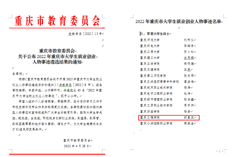 本网讯(文/图 招就处 叶秋清)近日,重庆市教委发布《重庆市教育委员会关于公布2022年重庆市大学生就业创业人物事迹遴选结果的通知》(渝教学函〔2022〕13号)。我校数字艺术学院学生邬昌友事迹入选“2022年重庆市大学生就业创业人物事迹——军营大学生战士”。