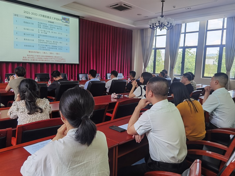 首先,张晓颖介绍了本次星级员工评选的目的、标准和要求。随后,8位参评候选人逐一进行了汇报展示。党政办黄璐老师分别从自我认识、工作业绩与发展目标等方面进行了展示汇报,提出在工作中要主动思考,理清思路,合理规划,积极学习新知识,保持乐观向上的态度,积极探索。人事处刘孟卓老师提出作为职能行政人员一定要有召之即来,来之能战的勇气和力量,即使是在同一件事情上也要做到服务无止境。招生就业处叶秋清老师在就业干事岗位上真正做到就业数据真实守底线、精细服务谱新篇,印证了在平凡的岗位做着不平凡的事情,确保我校就业工作有序推进。面对繁琐的事务性工作学生处何杰玲老师始终有木铎之心,坚持砥砺前行。教务处袁敏老师、教发中心张静老师和图书馆邓世美老师等的汇报也淋漓尽致地体现出重工职能人员的精神面貌和风采。