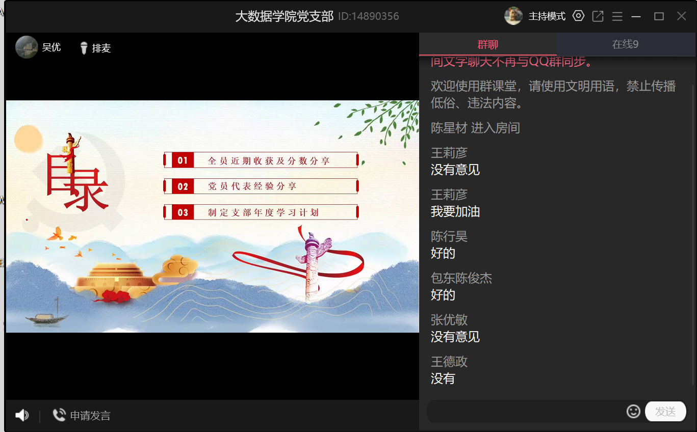 携一缕浅夏的芬芳,凝一脂冰清玉洁的清梦,五月特有的浓郁连同崭新的学习计划悄悄来临。大数据与人工智能学院党支部根据市教委对学校的要求,为提高对“学习强国”平台的利用,于2020年4月30日晚19:00全体师生党员相约QQ群课堂,围绕“学习强国、进步你我”的活动主题进行深刻地交流,并率先启动大数据学院党支部“学习强国”学习计划。