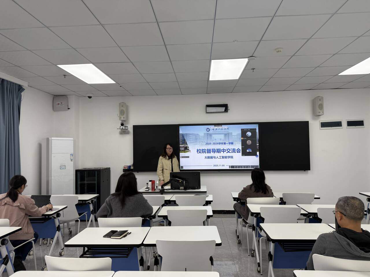 本网讯(文/图 大数据与人工智能学院 李可比)11月5日,我院在学7209召开校院督导期中交流会。校教学督导闫静、学院教学副院长廖宁及学院全体教学督导出席会议,会议围绕基层教学组织建设标准学习、实训教学问题研讨、AI评教等议题展开深度交流,为期中教学质量提升找准方向、规划路径。