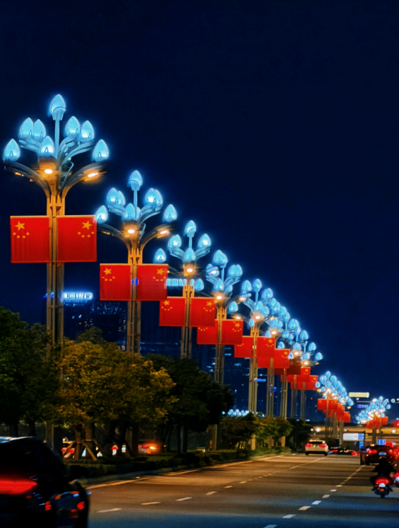 经评选,李颖的作品在六十多份作品中脱颖而出,荣获此次活动一等奖,一排造型独特的路灯亮起蓝白色灯光,道路上车流穿梭,远处高楼的灯光与路灯交相辉映,营造出浓厚的国庆氛围,彰显出城市在国庆时的繁华与喜庆,传递出对祖国的热爱与祝福。