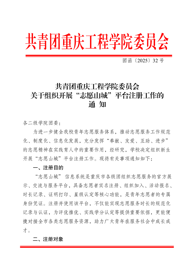 共青团重庆工程学院委员会关于组织开展“志愿山城”平台注册工作的通知