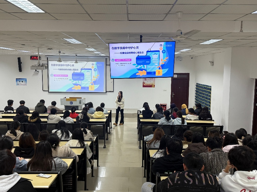 为响应学校关于世界精神卫生日的双十活动号召,提升大学生对数字时代心理健康的科学认知,引导他们深刻洞察数字生活环境对自身心理状态的双重影响。2025年11月12日下午15点,心理健康教育与咨询中心开展了数字健康主题讲座,帮助学生构建健康的个人网络心理生态,本次讲座由心理专任教师章淇莉进行汇报,共169名来自大数据学院与软件学院的同学参与其中。