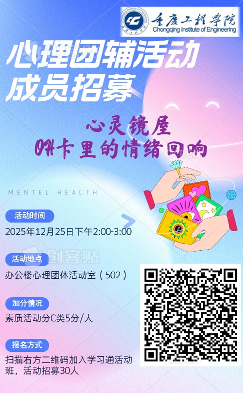 2025年12月25日(周四)下午2:00-3:00,心理健康教育中心的章淇莉老师面向电子信息学院与智能制造学院学生,组织开展了一场以“心灵镜屋:OH卡里的情绪回响”为主题的心理团体辅导活动(办公楼502),参与者共31人。此次活动通过OH卡牌这一心理学工具,引导学生觉察、命名、接纳并转化自身情绪,提升情绪管理能力与自我关怀意识。