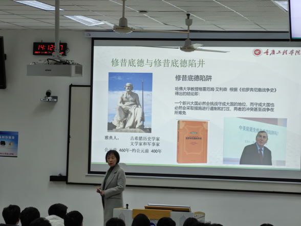 在讲授国家安全是什么时,杨桂以“修昔底德陷阱”为切入点,重点讲授了修昔底德是什么、修昔底德陷阱与战争的关系、修昔底德陷阱与中国的关系,引导学生思考新兴大国与守成大国是否存在矛盾?最后以习近平总书记在《世界邮报》创刊号访问中的“我们都应该努力避免陷入‘修昔底德陷阱’,强国只能追求霸权的主张不适用于中国,中国没有实施这种行动的基因”讲话,旗帜鲜明地表明中国是坚定不移地尊重和保障各国家或地区的国家安全的立场。