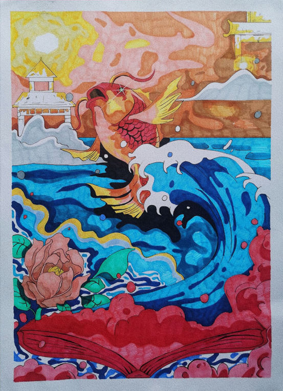 2描绘场景:一条鲤鱼从书中腾跃而出,掀起大风大浪。