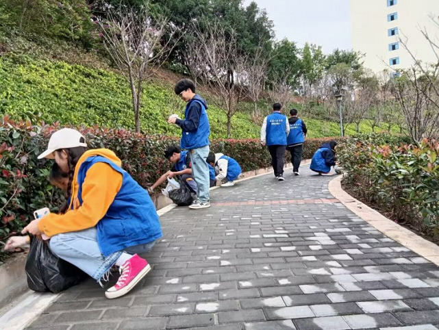 志愿者们分工明确、秩序井然地开展樱花大道道路清理工作。志愿者们身穿蓝色马甲、手拿清扫工具,认真对道路两旁的杂草及垃圾进行清理,装进自备垃圾袋,最后统一进行处理。