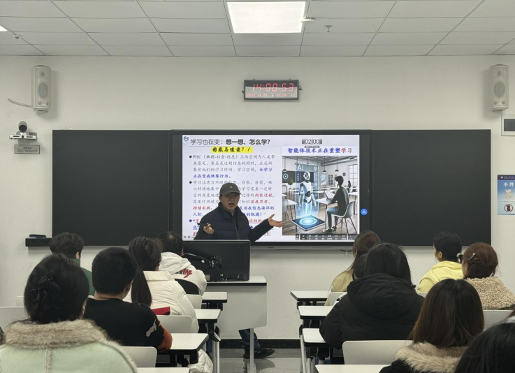 “世界在剧变,我们怎么办?”张教授以波士顿动力机器人、宇树机器人成都演唱会伴舞等热点视频开场,直指“智能体技术正在重塑学习”的时代命题。他结合PHC(物理—社会—信息)三维空间带来的信息过载现象,剖析“学习时间碎片化—知识结构破碎化—认知能力分散化”的循环困境,引导大学生“用系统化的硬核能力对抗碎片化焦虑”,引发学生共鸣。