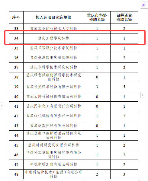 近日,重庆市科协公布了2025年重庆市科协青年科技人才托举工程拟入选项目实施单位名单及资助名额,共立项48个单位、150个托举名额。我校作为唯一民办高校科协入选该名单,并获得2个全市青年科技人才托举名额。