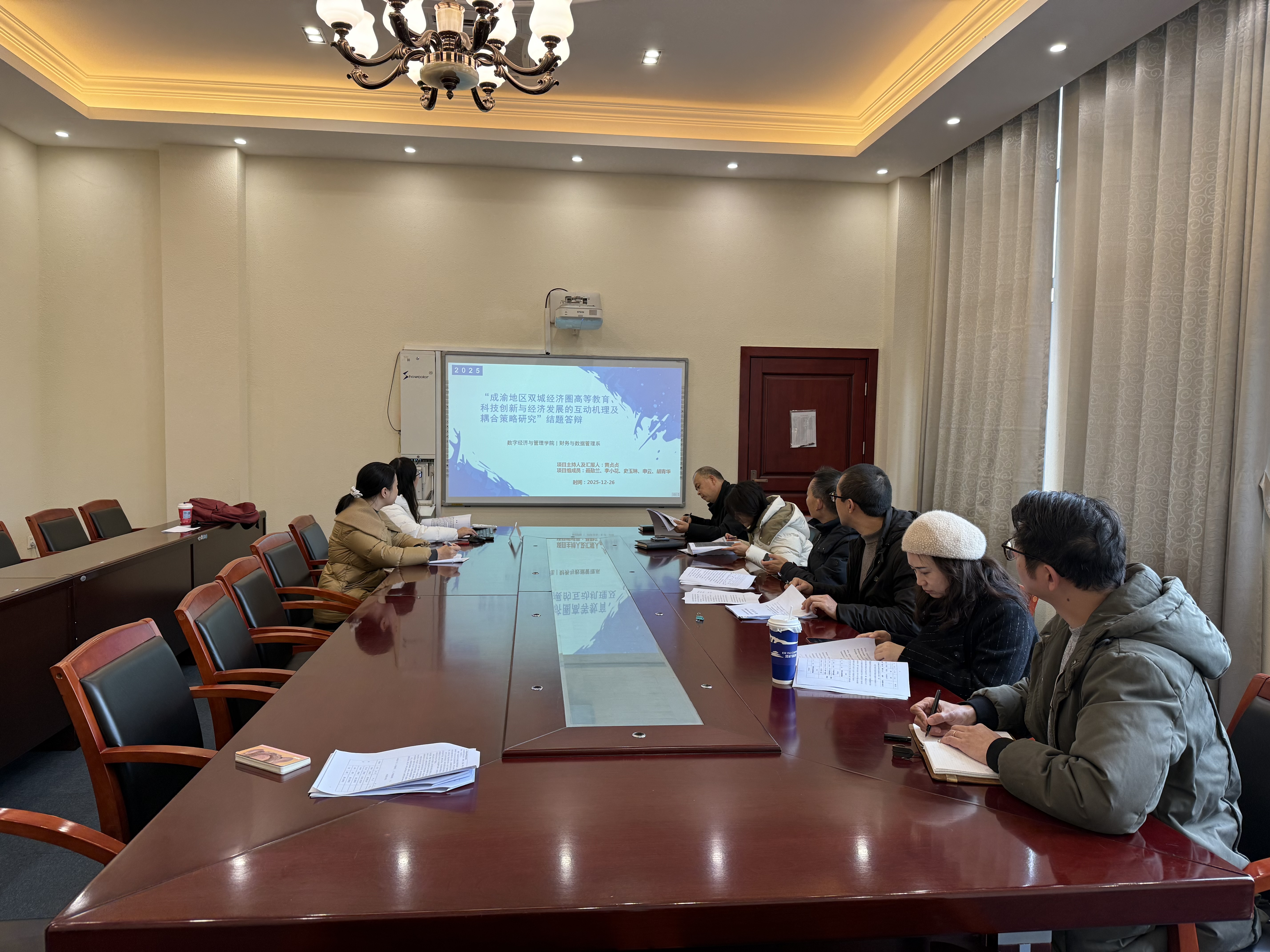 随后,评审工作正式开始。本次重点评审的课题是由黄贞贞老师主持的“成渝地区双城经济圈高等教育、科技创新与经济发展的互动机理及耦合策略研究”。黄贞贞老师从课题的研究背景与意义、研究思路与方法、主要研究内容、创新点、研究成果以及结论与展望等方面进行了详细汇报。该课题聚焦成渝地区双城经济圈国家战略,深入探讨了高等教育、科技创新与经济发展三者之间的复杂互动关系及其耦合协调机制,并提出了具有前瞻性和可操作性的策略建议。
