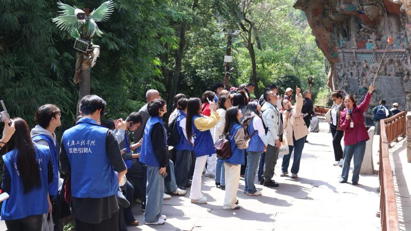 下午,同学们前往世界文化遗产大足石刻,开启深度文化研学之旅。大足石刻以精湛的雕刻技艺、丰富的题材内容闻名于世,是中国晚期石窟艺术的杰出代表。在专业讲解员的带领下,大家依次参观核心造像区域,聆听雕像背后的历史故事、人文内涵与艺术特色。古代工匠的智慧与匠心令同学们赞叹不已,大家驻足观赏、认真记录、积极交流,深刻体会到中华传统文化的博大精深