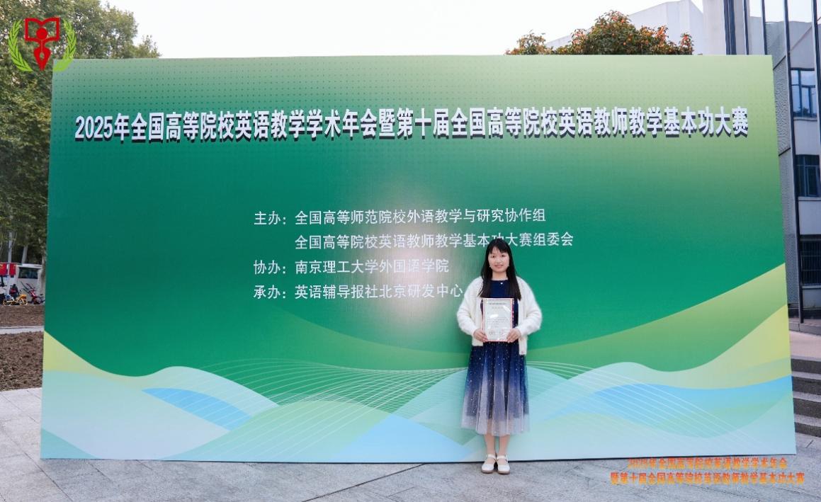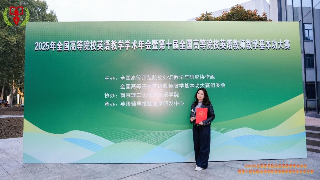 本网讯(文/图 基础学院 黄柳)2025年10月26日,第十届全国高等院校英语教师教学基本功大赛全国总决赛在江苏南京落下帷幕。我校基础学院外语教研室教师黄柳、蹇佳、周丹、丁福聚代表学校参赛,与来自全国220所高校的优秀教师同台竞技,凭借扎实的教学功底和出色的现场表现共斩获国家级奖项3项、省部级奖项3项,实现了教学竞赛与学术研究的双重突破。