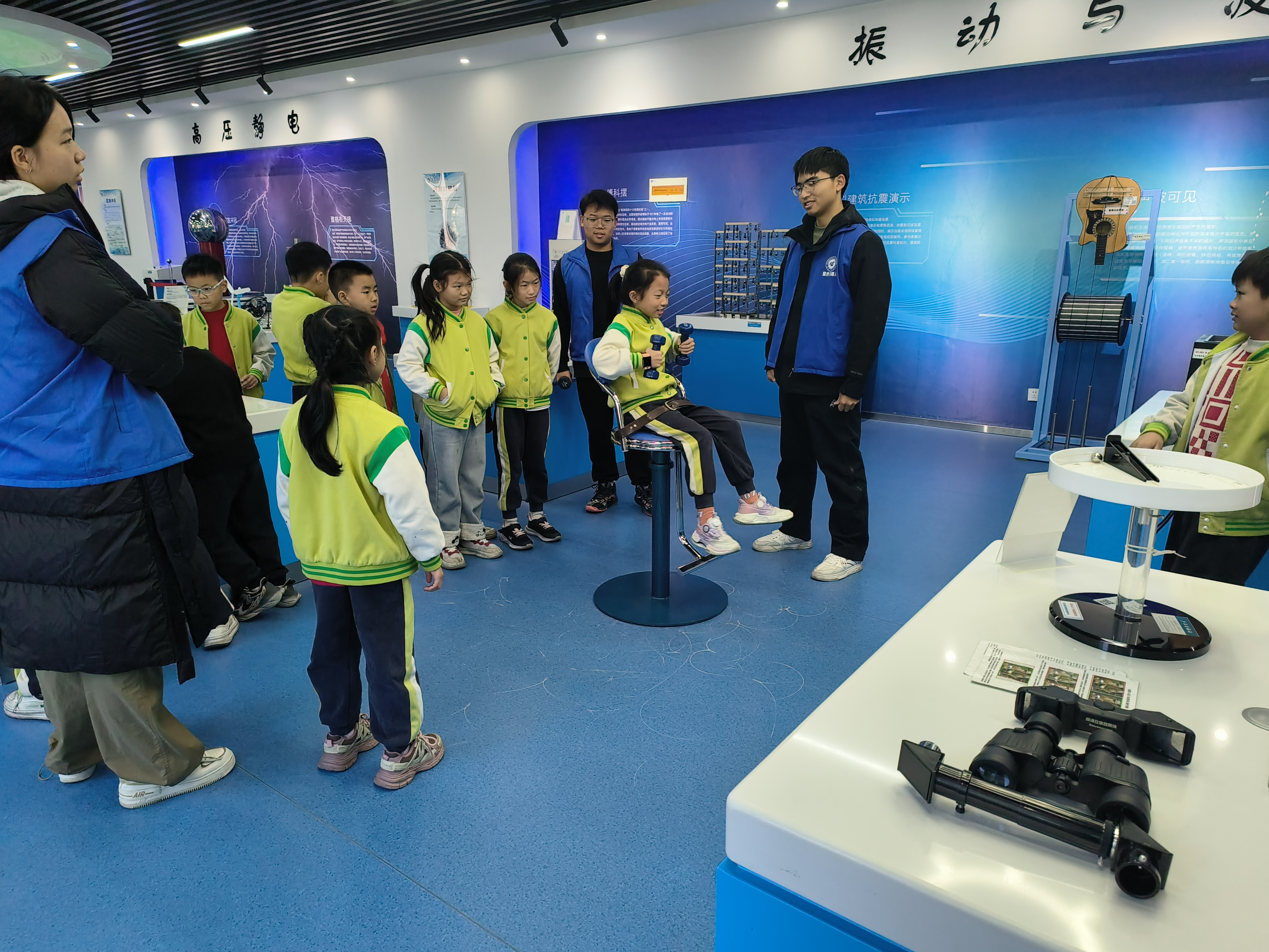 “探索物理奥秘”环节依旧人气高涨。“鱼洗”的喷水奇观、“水从天上来”的视觉震撼、“同自己握手”的趣味互动,以及共振小娃、地震演示仪等设备的神奇效果,让同学们目不暇接、惊叹不已。同学们积极向工作人员提问,认真聆听原理讲解,在亲身体验中建立起对物理学科的初步认知,激发了探索未知世界的浓厚兴趣。