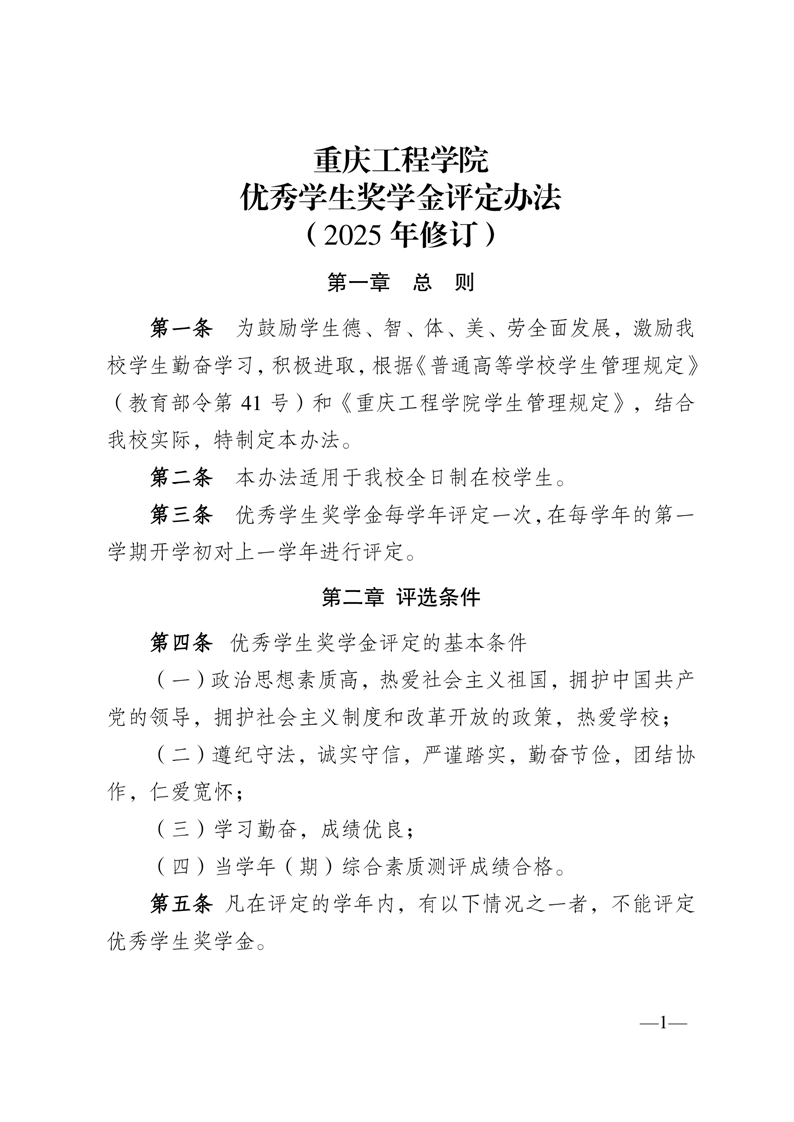 重庆工程学院优秀学生奖学金评定办法(2025年修订)