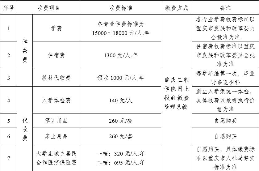 1.入学体检费:根据重庆市教委的相关规定,所有新生入学报到后、学籍注册前由学校统一安排体检,入学体检费200元/人,具体收费以最终执行价格为准。