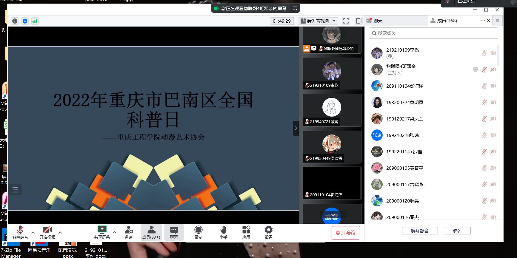 本网讯(图/文 中华文化动漫研发传播中心罗能凤)2022年9月25日,中华文化动漫研发传播中心老师罗能凤策划并主持了题为“中国生态重建之路”的线上观影活动。活动线上以观影和讨论相结合的方式开展,片中向大家展示了可可西里藏羚羊的生存状态和志愿者保护巡逻队的成立、保护工作中的危险和艰难,可可西里保护站成立的艰辛历程,除了野生动物方面的问题,在GDP数据不断攀升的同时,环境污染也不断加重,生态急剧恶化……。学生们从观影中真切地体会到野生动物保护工作的艰难和危险,感受到野生动物保护和我们生存环境的密切关联,认识到志愿者们对人类,对社会所做出的伟大贡献。本次活动吸引了动画专业、数字媒体艺术专业等350多名同学参加。