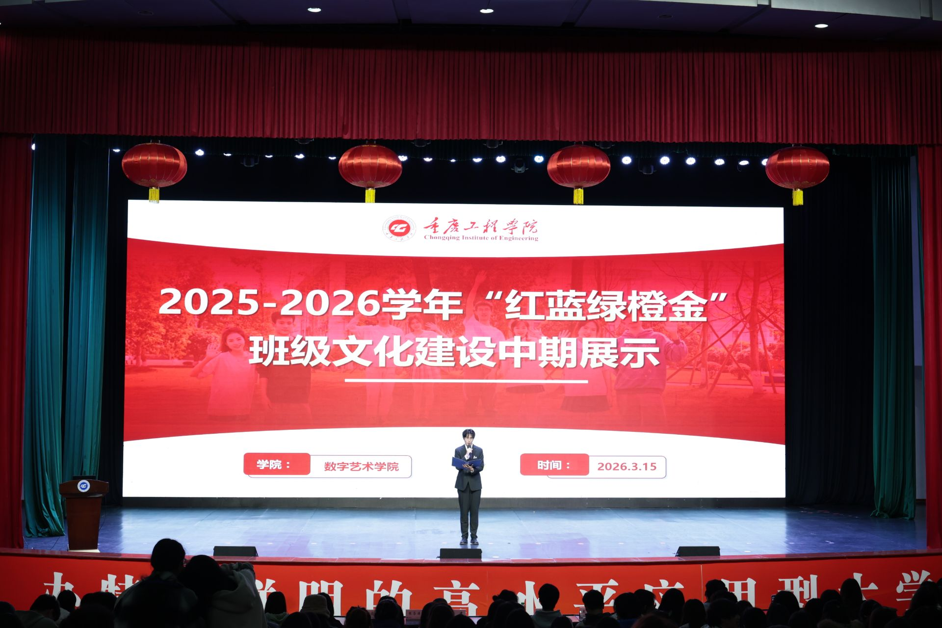 本网讯(文/图 杨道珍)为集中展示数字艺术学院“红蓝绿橙金”班级文化建设中期成果,搭建交流互鉴平台,强化学风建设,学院于3月15日18:00在学术报告厅开展了“红蓝绿橙金”班级文化建设中期展示活动暨2026年学风建设启动会。学院辅导员及2023、2024级全体同学参会。